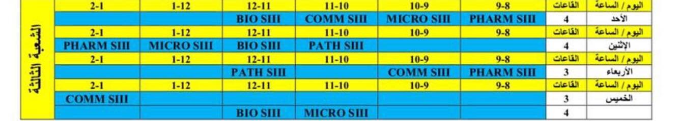كل مجموعة(شعبة) فيها وقت محدد لكل مادة (تتضمن مادة الكيمياء العضوية)، بكون الدوام فقط ٤ ايام بالاسبوع.